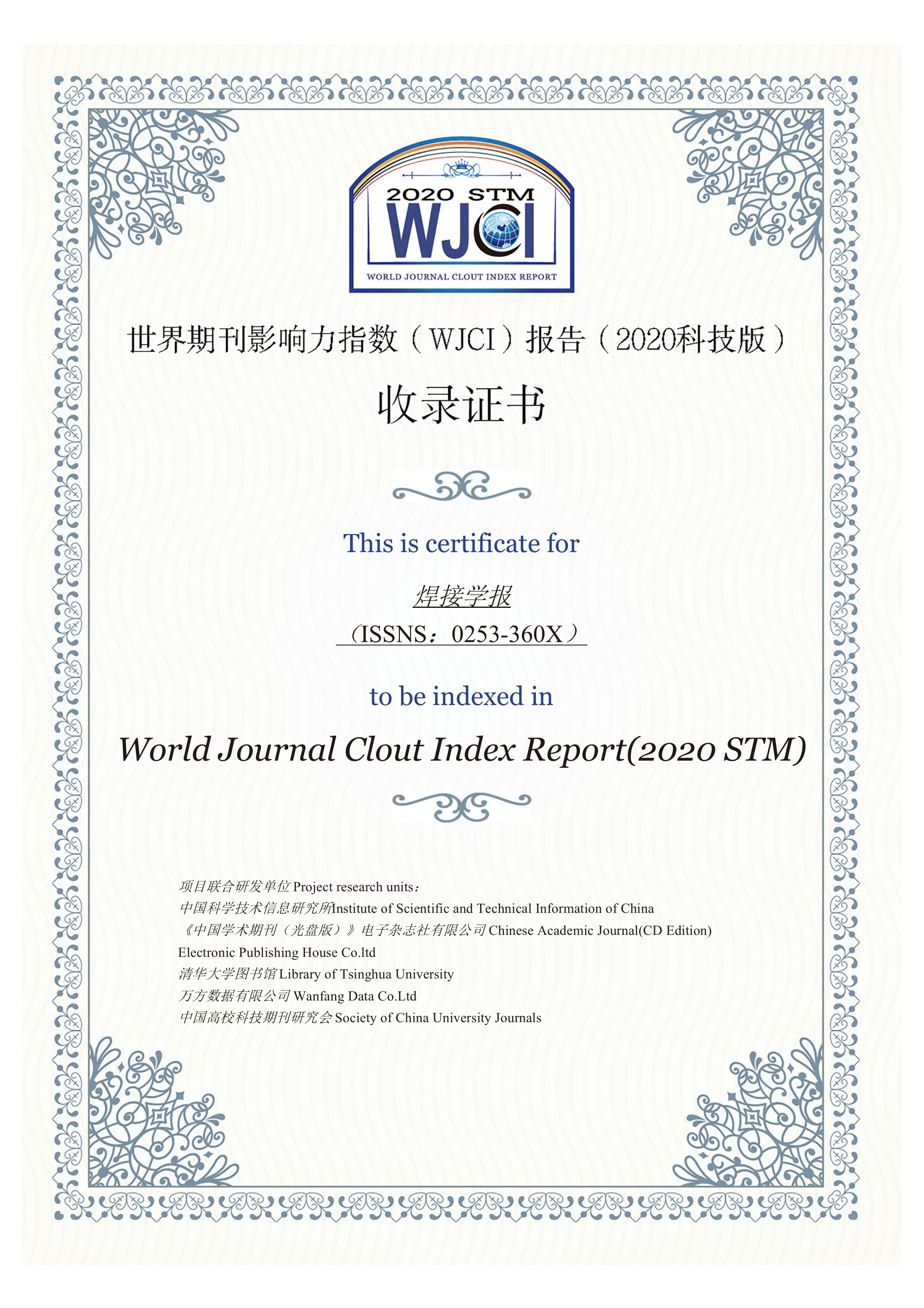 近日,《世界期刊影響力指數(shù)(WJCI)報(bào)告(2020STM)》發(fā)布,《焊接學(xué)報(bào)》以其較高的學(xué)術(shù)影響力及行業(yè)認(rèn)可度成功入選。